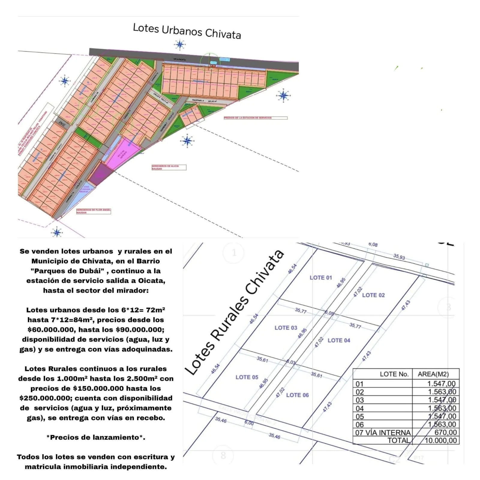 Lotes en Venta Municipio de Chivatá, Boyacá. Área Urbana: Inversón desde $60.000.000 hasta $90.000.000. Área: 6*12=72 m2 Área: 7*12=84 m2 Servicios: Agua, Luz, Gas. Nota: Se entrregan con vías en recebo. Legalización: Todos los lotes se vendes con escritua y matricula inmobiliaria independiente. Inversión: Se aceptan Permurtas no sobrevaloradas.